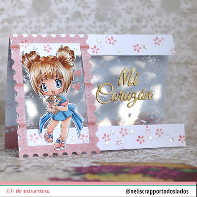 Una vez coloreada, troquelé el panel con un troquel rectangular con una bonita cenefa en los bordes (del mismo set que los cuadrados) y lo monté sobre una cartulina texturizada rosa.